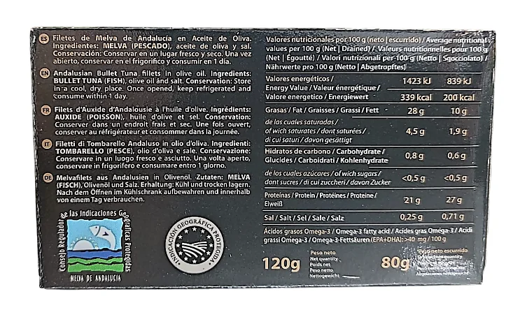 • Materia prima certificada: melva de Andalucía, fileteada a mano y envasada con máximo cuidado.