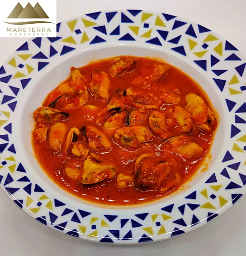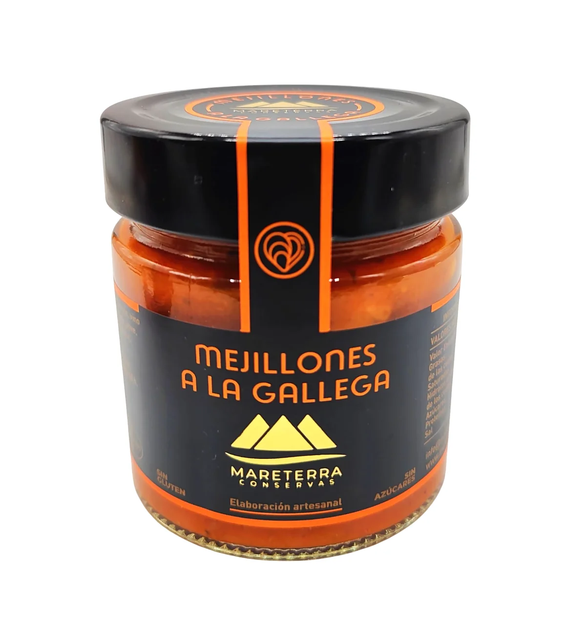 Mejillones a la gallega Mareterra elaborados con mejillón y salsa gallega con tomate, verduras, AOVE y especias. Una conserva de marisco artesanal, natural, sin gluten, sin azúcares y sin aditivos ni conservantes, perfecta para abrir y servir a temperatura ambiente. El sabor tradicional de unos mejillones a la gallega gourmet, listos para abrir, servir y disfrutar.