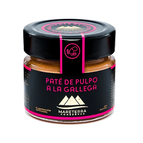La esencia del pulpo a la gallega en un paté gourmet listo para untar y disfrutar al momento. Paté de pulpo a la gallega Mareterra, elaborado con pulpo, patata, aceite de oliva virgen extra y pimentón. Un paté natural artesanal, sin gluten y sin aditivos ni conservantes, perfecto para abrir, servir y disfrutar en tostas, canapés o aperitivos gourmet.