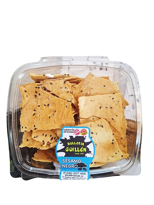 El sésamo negro aporta un toque diferencial tanto en sabor como en presentación, mientras que la mezcla de aceite de girasol y aceite de oliva ayuda a conseguir una textura agradable y un perfil más redondo. Son ideales para acompañar tablas, canapés, quesos, embutidos, conservas, patés o simplemente para disfrutar como aperitivo por sí solas.